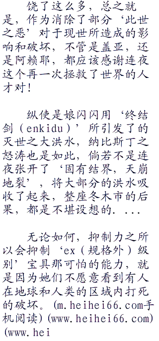 因而,作为一个阴暗面情感的集中意志,作为背负了一个世界的恶意的代表性存在,avenger‘安格拉曼纽’这个‘此世之恶’的意志是不可能真正被抹除的,就算是恶意的行径都已经被强制性的根除了,但是人类内心里的恶意依旧会存在。
