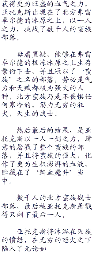 不过,‘鲜血魔井’目前为止所贮藏“零零零”的血气之力,还不足以把连夜一瞬间力量提升(powerup)到这种地步,下级恶魔的血气精华,比起普通的人类都还有所不足。饶是如此,痛苦利刃的剑气激荡而过,也足以将这片战场几乎分成了两段,血色剑气的纵横之处,更是有无数下级恶魔的血肉之躯直接化作了与之相为映衬的血色。