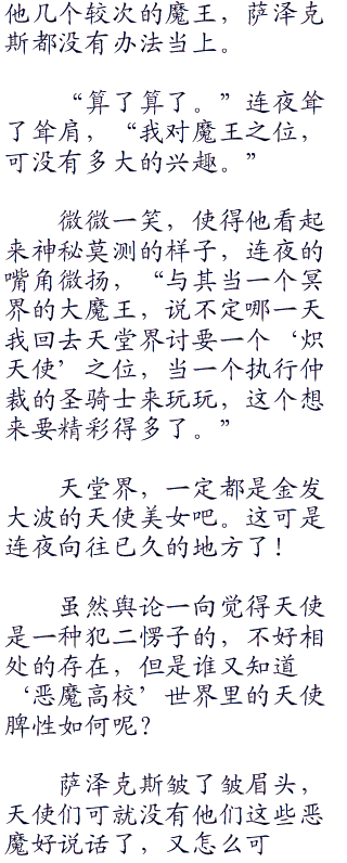 摇了摇头,连夜立刻将这种令人毛骨悚然的生活方式从脑袋当中驱逐了出去。恶魔怎么了?恶魔也要谈恋爱咧!