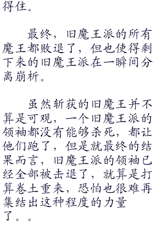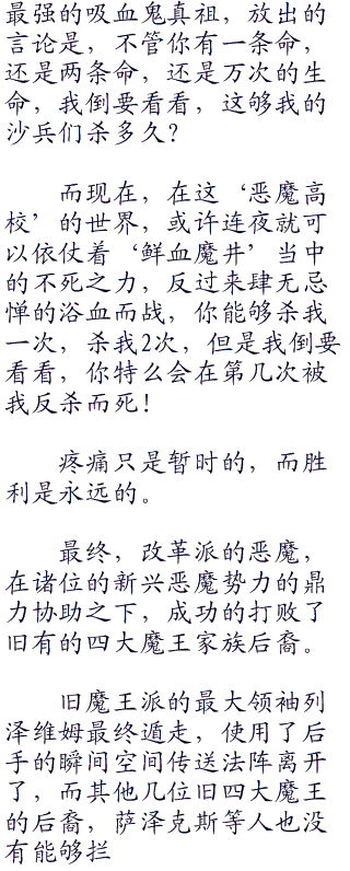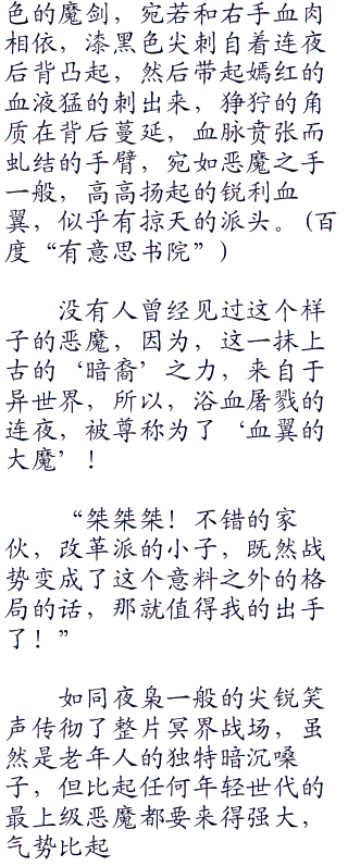 随着‘血翼的大魔’的掠天之翼激昂,恶魔士兵们发现自己,也涌现了战斗的渴望,跟随着‘血翼的大魔’投入了一次又一次的战斗,每次战斗的狂热都赋予他们十倍的力量,直到他们赢得最不可能的胜利为止。