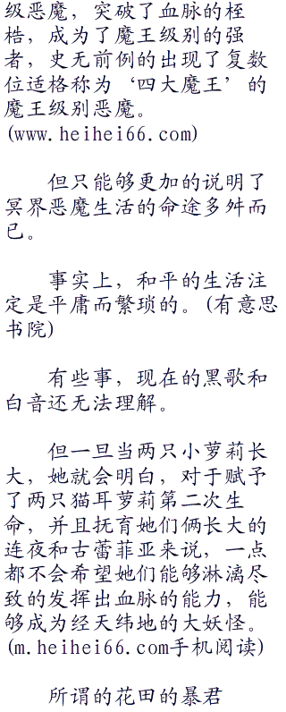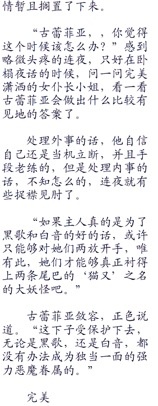 安逸的生活,疏松了两只小萝莉的筋骨,被连夜完全的恩荫了下来的安全环境,懈怠了两只小萝莉的志气,因为有他可以依靠,可以撒娇,两只小猫咪可能会进一步产生脑部“零零零”萎缩下去的状况,变成彻彻底底的幸福的‘笨蛋’,忘了身位上位血统的大妖怪的志气和骄傲。