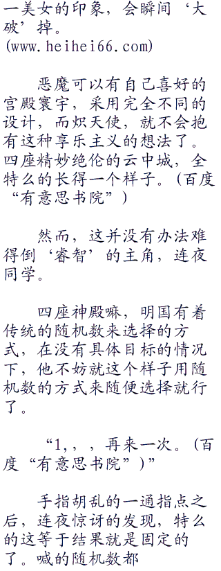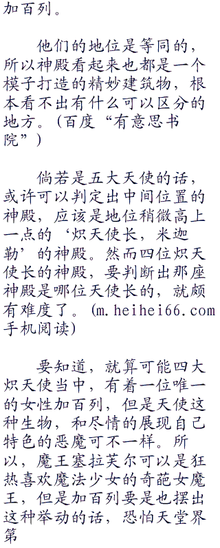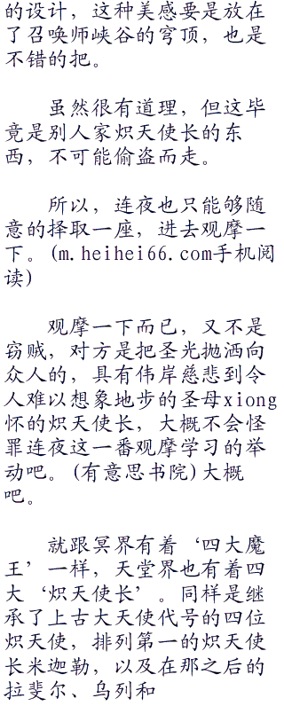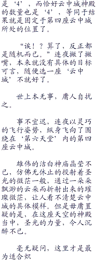 天堂界用以巡礼的战斗用天使小队,以他们(她们?)那一根筋的思维方式,自然也无从察觉出有一个叫做‘连夜’的伪‘天使’,偷偷的溜上了‘第六天堂’。