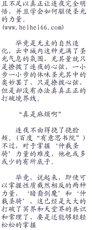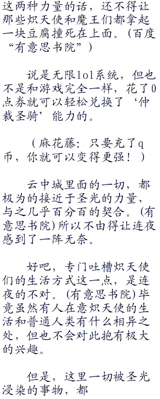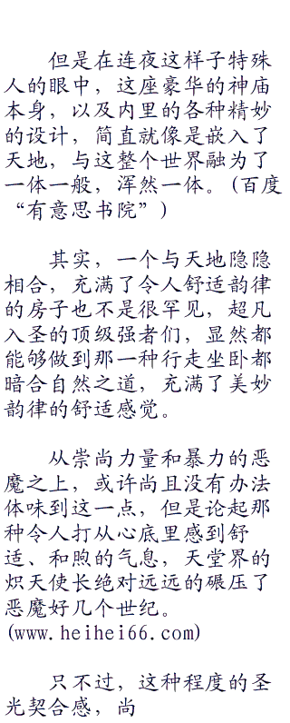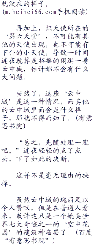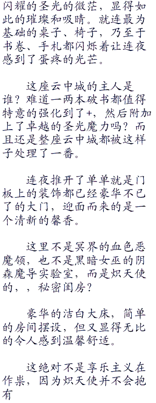 所幸作为suoner(召唤师)而言的百般精通之处,在此刻得到了淋漓尽致的发挥,就算是在这炽天使的云中城之内,连夜也可以像是一个潜行的刺客一般,来去自如。