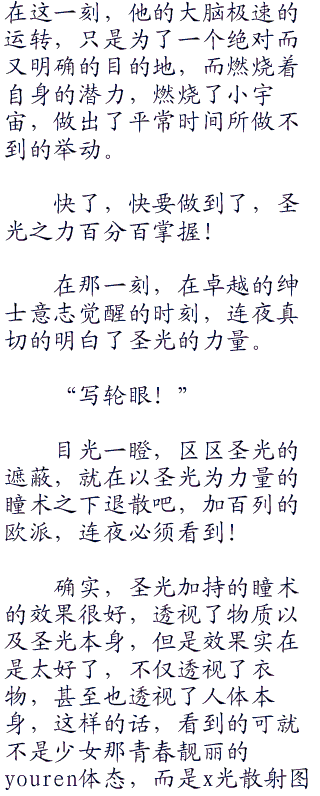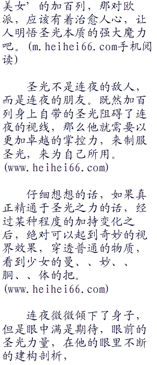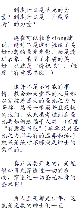 要是你跟这位破坏了人类幻想的圣骑士大叔理论一下的话,说不定按照圣骑士一本正经的死脑筋,就会和你大谈阔论一番,以高傲的姿态说道,天使之美绝对不在于她的躯体,也不在于她的体态和xiong部,而在于真正的心灵之美,所以,被圣光所遮蔽的场景,只不过是梦幻空花,毫无意义罢了。