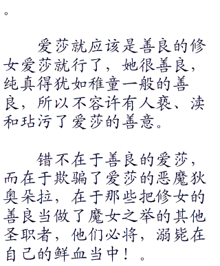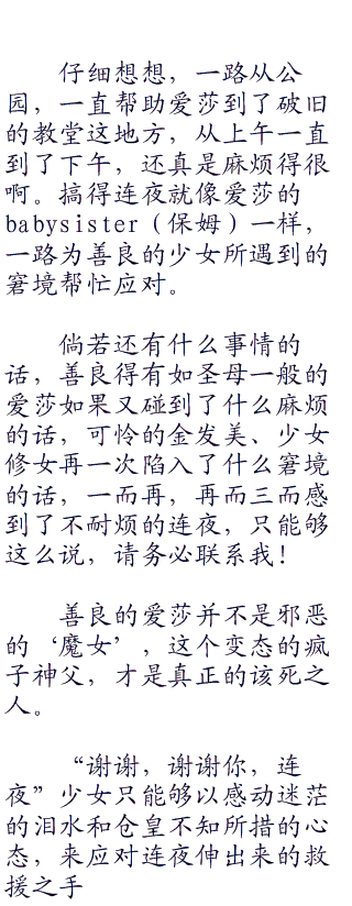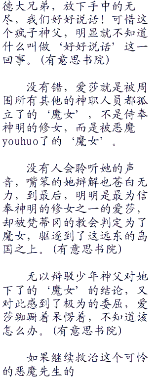 “我,我”爱莎张了张嘴,不知道该说什么,眼前的这个神父虽然年龄和她差不多,但是她发现自己在神父面前,却根本没有丝毫的底气。