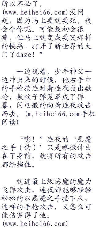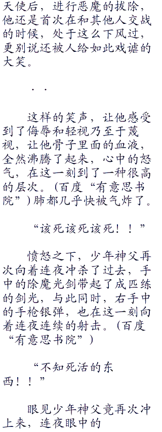但是以菲利德的疯子心态,却是愈加的扭曲了开来,“你这家伙,值得我动真格的了。我的名字是菲利德&a;a;#1;赛路斯,是从属某恶魔祓除组织的末端喔。啊,别因我报上姓名,而你也要报上姓名。因为我的脑容量不可能会记入你的名字,