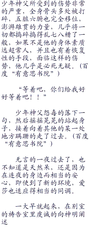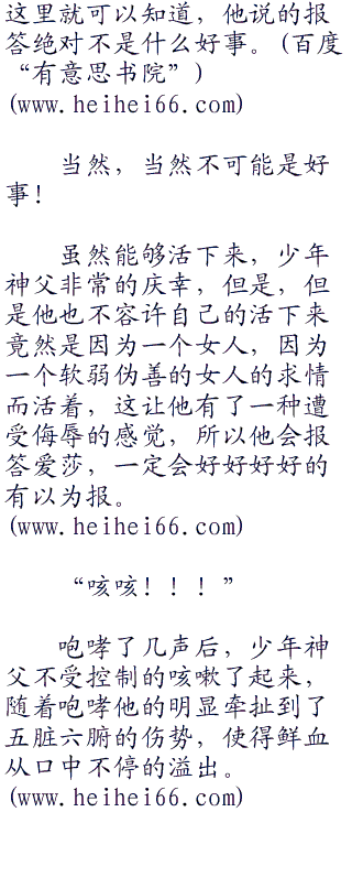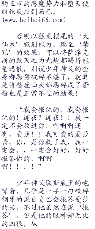 当连夜和爱莎离开后,大约过了十几分钟的样子,少年神父才从砖石堆底下爬了出来,当他爬出来的时候,面色非常的难看,显得无比狰狞扭曲,血液的痕迹从额角流至下颌,最后他更是怒不可遏的咆哮了起来。