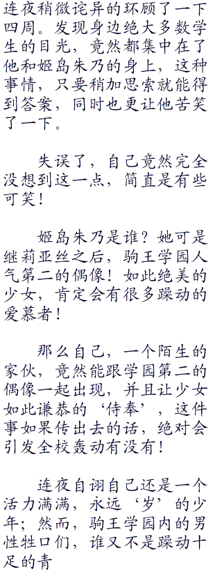 然而连夜,目前才‘十八’岁罢了,嗯,永远的‘十八’岁,所以他的心态好得很,充满了生机和活力,充满了思春期的躁动,充满了对于少女欧派的渴望和对于‘女孩子裙下到底有什么’的求知欲。