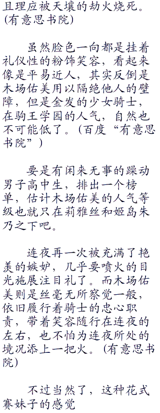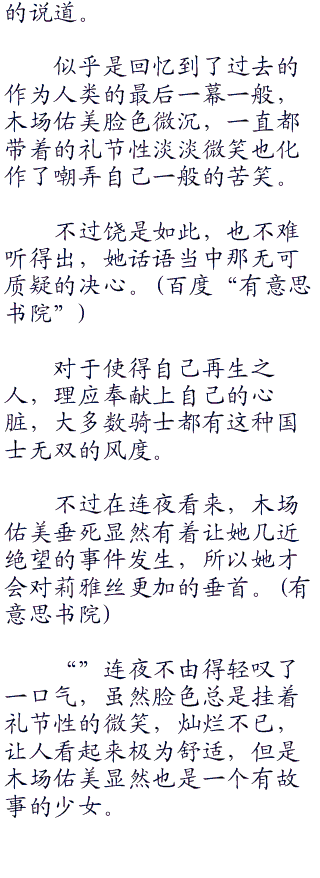 对于连夜这个暂定的莉雅丝的婚约对象,佑美很快就放下了心中作为骑士的警觉性,并且在另一个方面,像一个中世纪的骑士一般,对连夜极尽礼节。