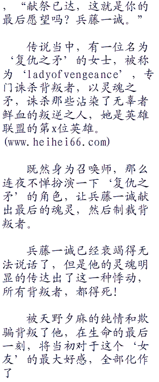 谁能来拯救我?就算是以我的最后一口气,以这股怨愤为誓约,奉献上我的灵魂。假若真的有和人契约的恶魔存在的话,那就帮我完成,复仇(vengeance)!