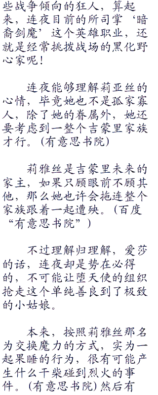 顺带着,连夜也解释了一番爱莎的来历,毕竟从表面上看起来,爱莎是一个来自于梵蒂冈天主教会的圣女,成为‘魔女’被教会放逐后为‘堕天使’的组织所收容,然后连夜对堕天使的组织感到不悦,又将小姑娘抢到了‘恶魔’的立场上。