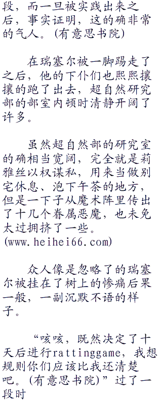 如此一来,瑞塞尔就只能够气焰熏天的怒骂着,然后被挂在二号树上,等着赶来的下仆们帮忙把自己抬下来了。