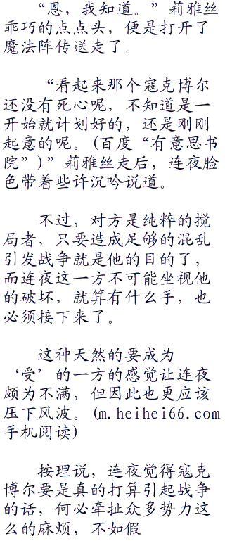“身份暴露已经不成问题了,很快三方就会在人间界进行和平的会谈,就算有魔王提前降临,也不成问题。”古蕾菲亚解释道,反倒是寇克博尔如果是经由连夜的手解决掉的话,问题就略为棘手了。