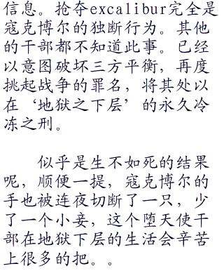 “伊莉娜的话,已经将包含我手的excalibur在内的五把excalibur和巴鲁帕的遗体带回了本部。因为破坏了统合成为一把的excalibur,将变成了核心的『碎片』回收了。嘛,夺回任务是成功了。只要有核心在的话就可以利用炼金术再次锻造圣剑了。”