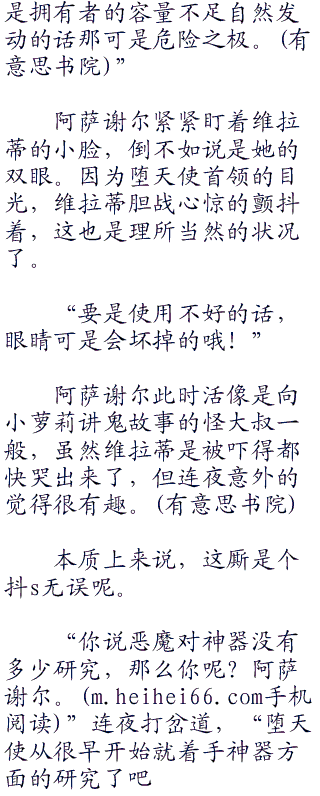 “不过说起加斯帕维拉蒂的话,我倒是有几句话要说。”阿萨谢尔显然不像传统的严谨研究员,意外的很健谈,“『停止世界的邪眼』的拥有者,不能运用自如就会造成坏影响。我认为只要能捕捉到神器的辅助道具不足的要素那就行了,虽然这样说,恶魔对神器的研究完全是没有进展呢。利用五感所发动的神器,要