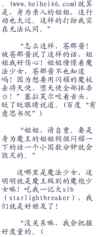 站在前面的是一脸为自家姐姐的行径而感到羞耻表情的苍那,但是她也硬着头皮劝说着塞拉芙尔,同时驱散着周围的好事观众。