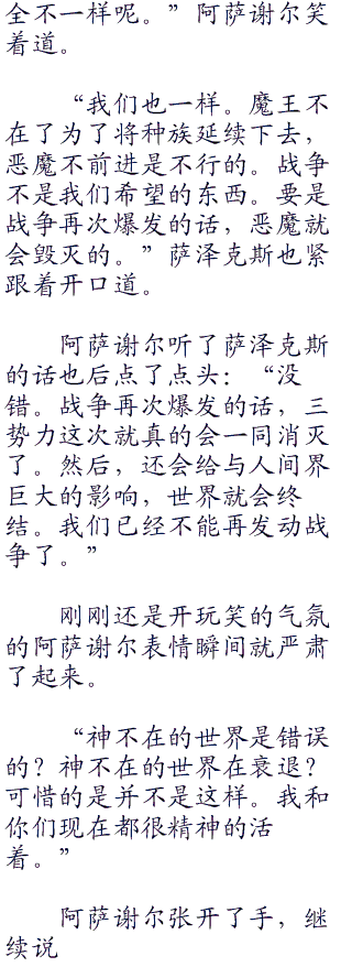 “阿萨谢尔,我想要问你的是,为什么你在这数十年里面不停的召集神器持有者?最初你召集人类我以为你是要增强战力。原本以为你是想要向天界和我们发动战争,但是”萨泽克斯骤然开口。