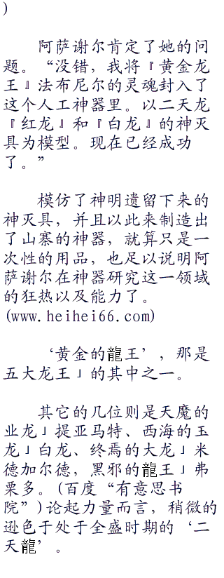 “…“五三三”…既然我是神器爱好者,肯定有尝试自己制作,复制品什么的呢。嘛,虽然大部分都是些垃圾呢。开发出神器的神真是厉害呢。这是我唯一尊敬那些家伙的地方。但是,太天真了。仅仅留下『神灭具』和『禁手』这些会破坏神和魔王还有世界之间平衡的『bug』就死掉了呢。不过,正是如此神器才会有趣呢。”