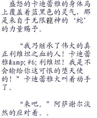 “痴人说梦!好,我现在就解决你。就由从消灭身为堕天使总督的你,作为创造新世界的第一步好了!”卡迪蕾雅用强硬的语气说出这句话。可是,阿萨谢尔看上去相当愉快的样子。