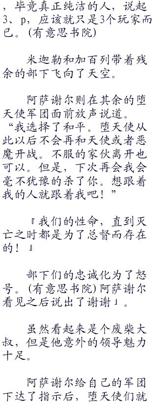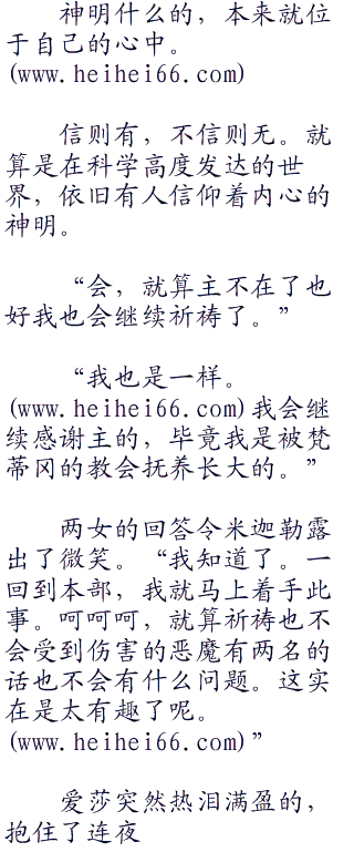 随即,米迦勒笑了起来,并点了点头。“我知道了。两个人的话,总会有办法的。她们两人都已经是恶魔,已经都不能靠近教会本部了呢。爱莎、杰诺瓦,我有问题问你们。神现在已经不在了吧?即使如此你们还要祈祷吗?”