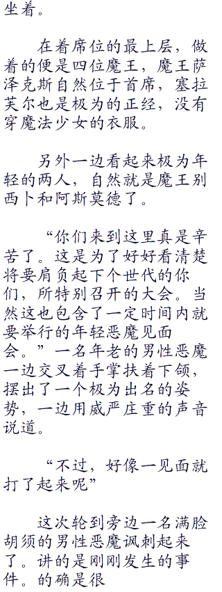年轻一代恶魔的会晤,也得以重新进行,相互打着招呼。除去刚刚的不良恶魔和他的眷属,众人都围在桌子旁。
