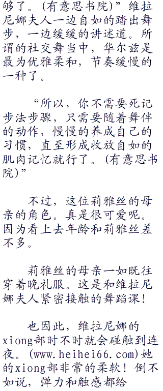 在位于吉蒙里本家不远处分馆的一个房间里。连夜正和莉雅丝的母亲,维拉尼娜夫人在练习跳舞。