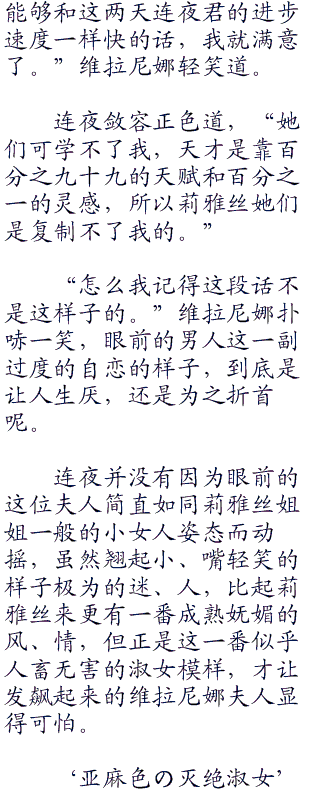 以前都着眼于冥界的内乱战争,殊不知恶魔的社会在舞蹈、宗教、手工艺乃至于二次元文化上都已经发展得相当成熟了。特别是精于舞蹈的维拉尼娜夫人,绝对有资格在这个连夜未曾涉及的方面,成为他的老师。