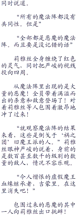 对手是狄奥朵拉&a;a;#6;阿斯塔洛特特。现身居别西卜家下任家主之位。虽然不知道他会使出怎样的能力,但是通过绝大的魔力,他是甚至连单骑突入也可能做到的恶魔。