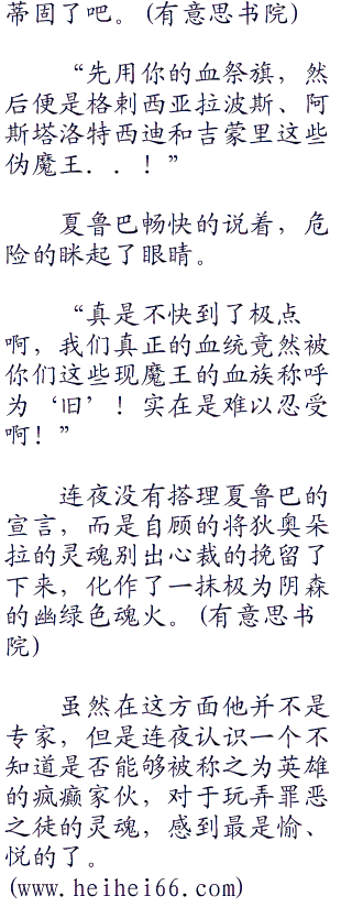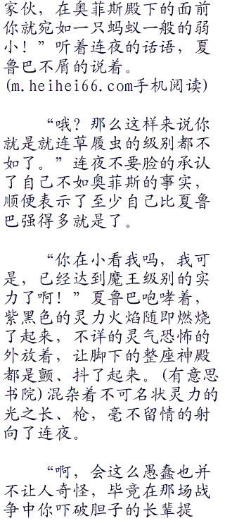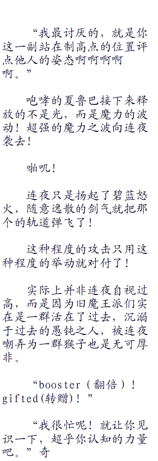 “好了,在毁灭现魔王的所有血脉之前,先将你这个伪装者杀死吧!”夏鲁巴淡淡地说,似乎对于自己可以杀死连夜有着无比的自信。