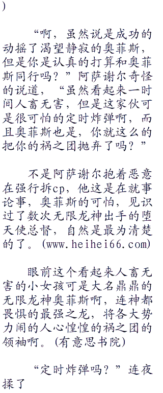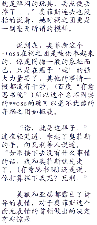 “是吗。那是又一次的终结啊!“四五零””瓦利一点吃惊的样子也没有。对于派系的消失没有感觉到一点的痛苦,严格来说,继承了路西法之名的他,应该就是旧魔王派系的才对。