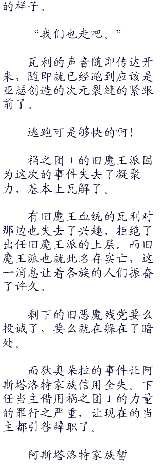 因为两大旧魔王的殒命,再加上奥菲斯好像也没打算继续鼓捣‘祸之团’这样子无关紧要的事情了,阿萨谢尔直接断言道,