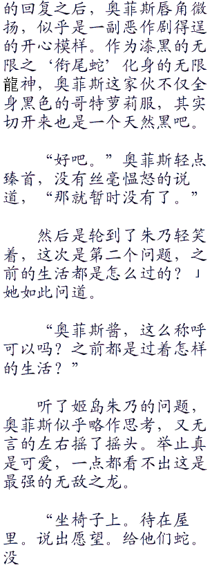 也就是说,从衣服到嗜好品,一无所有。可能就连她身上的黑色哥特萝莉服装也是用漆黑的‘蛇’之魔力凝聚的。