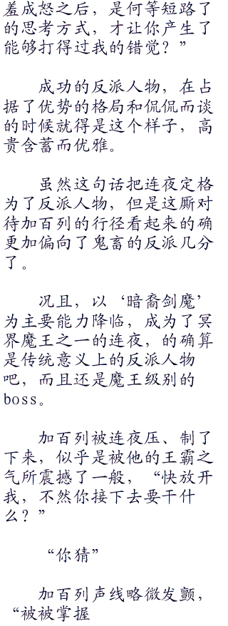 将对方的耻度和容忍度都逼迫到了最高点,步步紧逼直至强迫炽天使长做出了很羞耻的请求,最后一鼓作气用毫不留情的拒绝粉碎掉对方拉下脸来的请求,这种行径,即使在连夜看来,也未免贱到了极点。