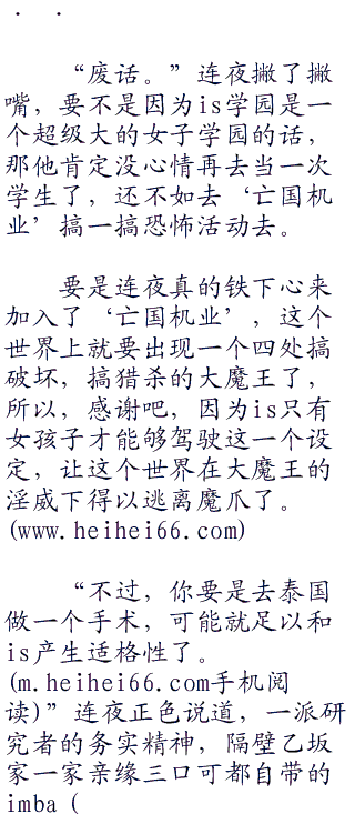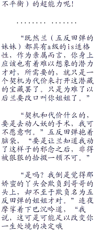 “不是我说,is难道不是只对女性产生反应的尖端兵器吗?为什么你却能够操纵呢?该不会我所认知的连夜,其实是一个女孩子吧。”