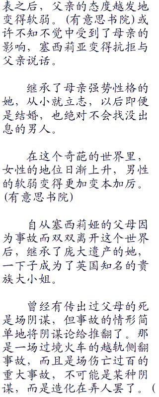 男性的软弱和卑微,日积月累的影响着塞西莉娅的心性。入赘名门的父亲,觉得自己完全比不过母亲吧。自年幼起就看着那样的父亲,『将来绝不和没出息的男人结婚』的念头,在塞西莉娅幼小的心中扎下了根。