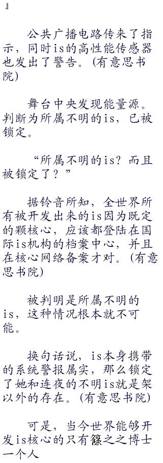 连夜耸了耸肩,“应该是入侵事件之类的把,说起来,is学园作为国际化的政治性兼盈利性的大学园,结果就连基础的,用以防备其它势力的is入侵的本领都没有吗?”