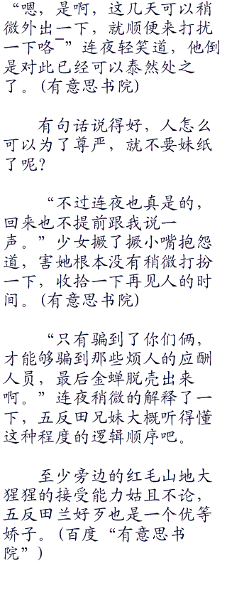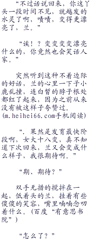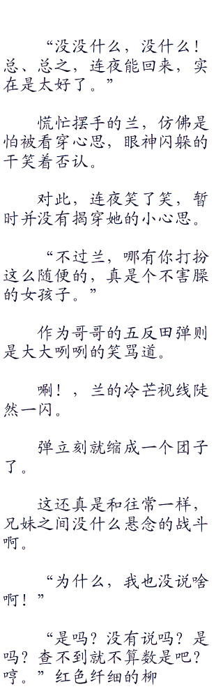 突然被撞见了这个样子的打扮,任是那个女孩子都会觉得有些慌乱吧,更不用说兰对于连夜还是有一些情意暗投的。