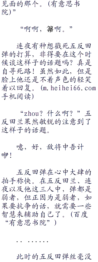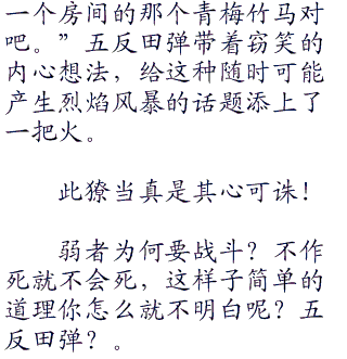 而且兰和连夜两人对待弹的方式简直如出一辙,让弹在心中有种大呼你们俩快结婚吧的冲动。这样子他就能够摆脱兰这个母夜叉了。