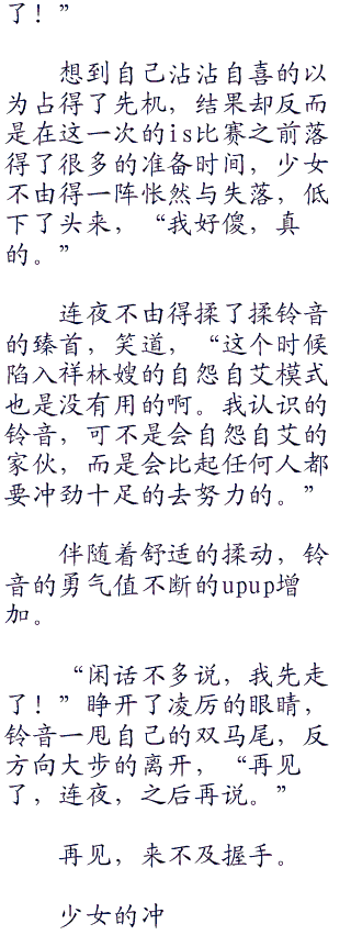 “郁闷,要是人家能和连夜一起吃晚饭就好了,就是铃铃酱,我也不能输,要拿出勇气来。”布佛本音迷迷糊糊的说着,让人丝毫看不出她有拿起勇气、下定决定来的倾向。