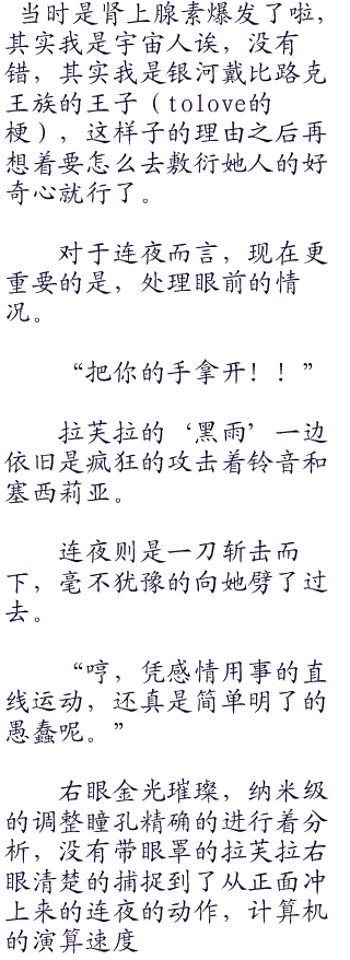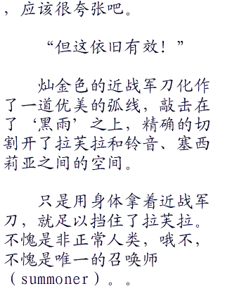 不断前进的拉芙拉的利刃逼得凰铃音不断后退,不过由于竞技场是圆形的,加上双方的机动性相差无几,所以却也没有办法再一步紧逼。