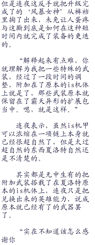 要想让夏洛特的第二世代专用机is‘疾风之再诞’进化,说起来也非常的简单,为非是接入特殊的兵器,登入新的数据和能量,使得第二代机体鸟枪换炮就是了。