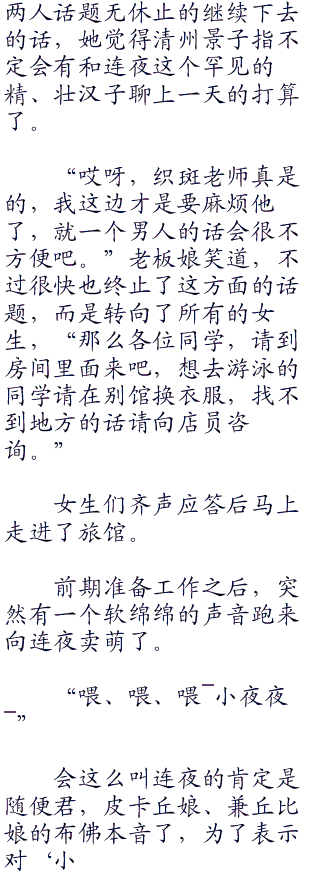 就算是连夜这样半路上一直在眯着眼微醺的懒散家伙,也在女生们的欢呼和夏洛特的戳戳捣捣之中也睁开眼看了外面,能够大白天看见这种没有什么人造风景的天然海面什么的,的确令人感到心旷神怡。
