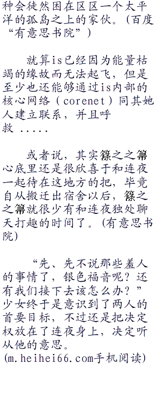 其实吧,远处传来的海浪声在耳旁既像是有规律又像是无规律一般的低声鸣奏着,远处的大海传来了潮汐的味道和海浪的声响。还有掠过的让人心旷神怡的凉风和还有照下来的灼热阳光。这样子的景象,无论如何都提醒了篠之之箒现在她身处于大海的孤岛上这一点。
