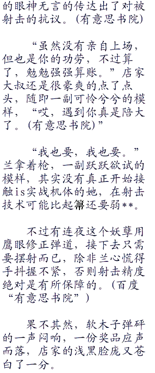 “哈哈哈哈,就这么说定了。”豪迈的边笑边说的射击店大叔,一身浅黑的肌肉,外套一件白色t恤,肩部和胳膊上隆起的肌肉清晰可见。虽说如此,看着却不像个坏人。