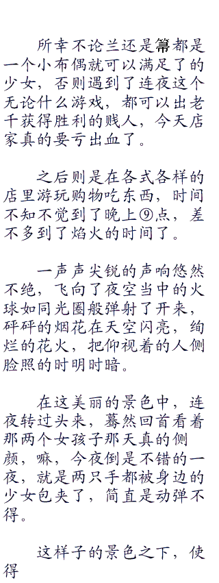 连夜在中间的位置,左边是箒,右边是兰,并肩走在人群之中。热闹的祭奠里,到处倒是带着带着孩子的父母,朋友以及恋人。