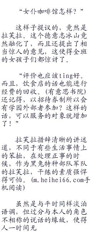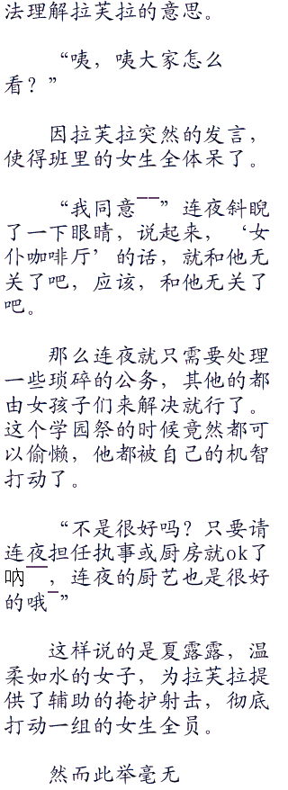 因为打败了塞西莉亚奥卢卡多,而且也得到了大多数女孩子同意的缘故,作为班代表的连夜,有要归纳意见的立场──。