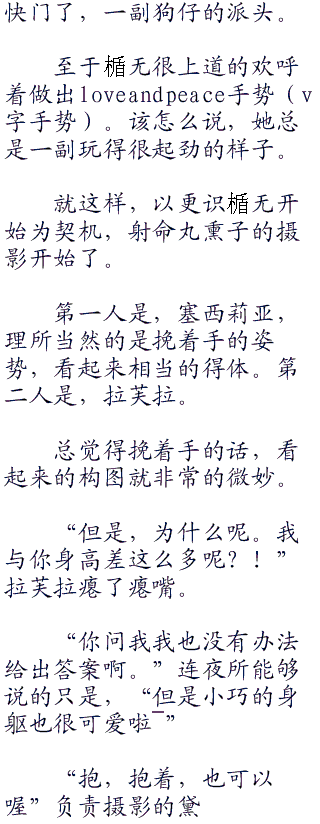 一下子不知道该说一些什么了,铃音脸红的低着臻首,咔哧咔哧地吃pocky(巧克力棒)。低着头的那个样子,总觉得像松鼠般那么可爱。