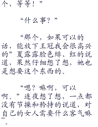 只告诉给女子组的秘密奖品。那就是『得到连夜头顶王冠的人,可以得到永久与他同居的权利』。