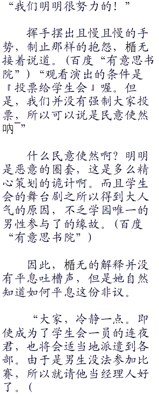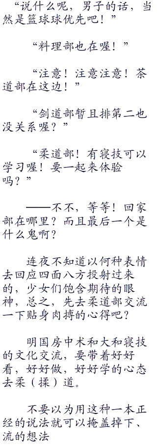“晚安,连夜君。从今往后可能会遇到很辛苦的事情喔~”在关掉chuang头灯之前,更识楯无说出了这么不明就里的一段话。作为传统的暗部家族,她获得的情报或许会比较多吧。