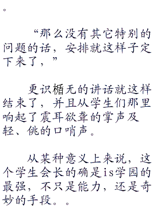 “虽然当前的危机已经初步的解除了,我也可以稍作休息了,要马上更换房间那还真是会变得激呐~,不过”更识楯无眼珠子骨溜溜的转着,一副揶揄的意味,“呼呼呼,我暂时还会住在这里喔?要说为何,因为我得到了王冠。”